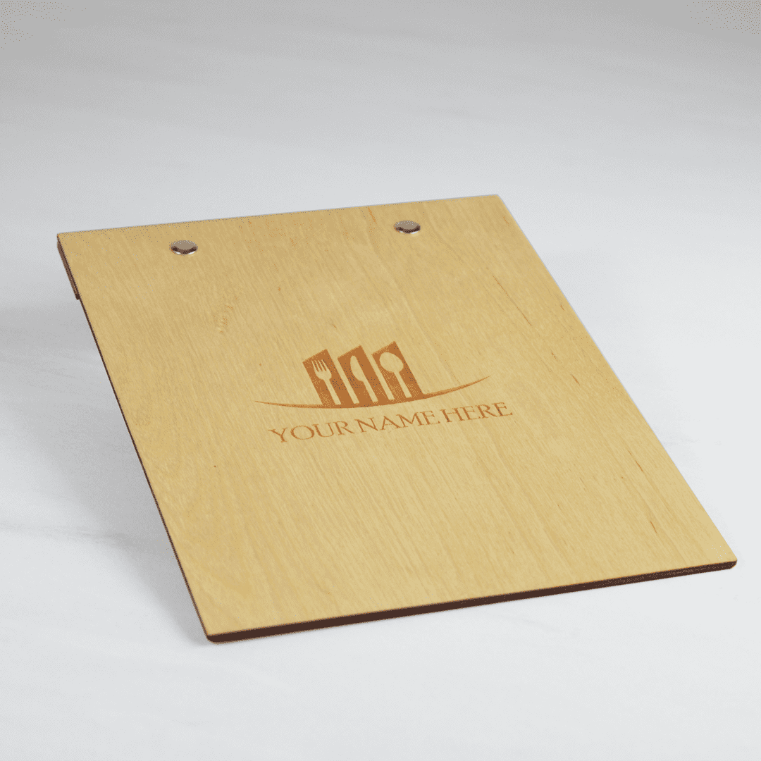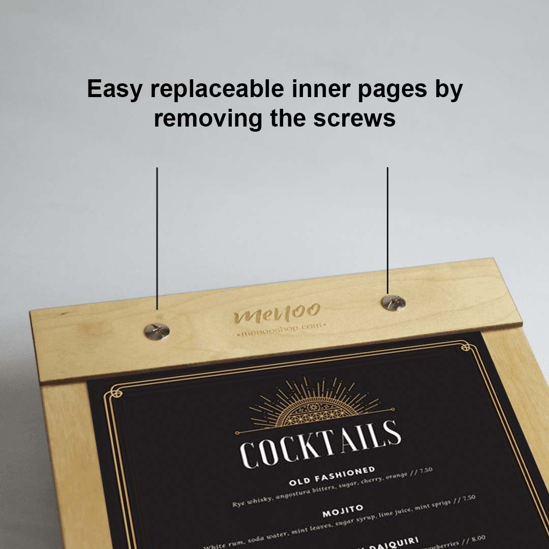 ✔ What’s included: Prices cover all laser engravings of your logos and internal accessories (screws, metal rings and wooden components) required to hold your menu’s inner pages.