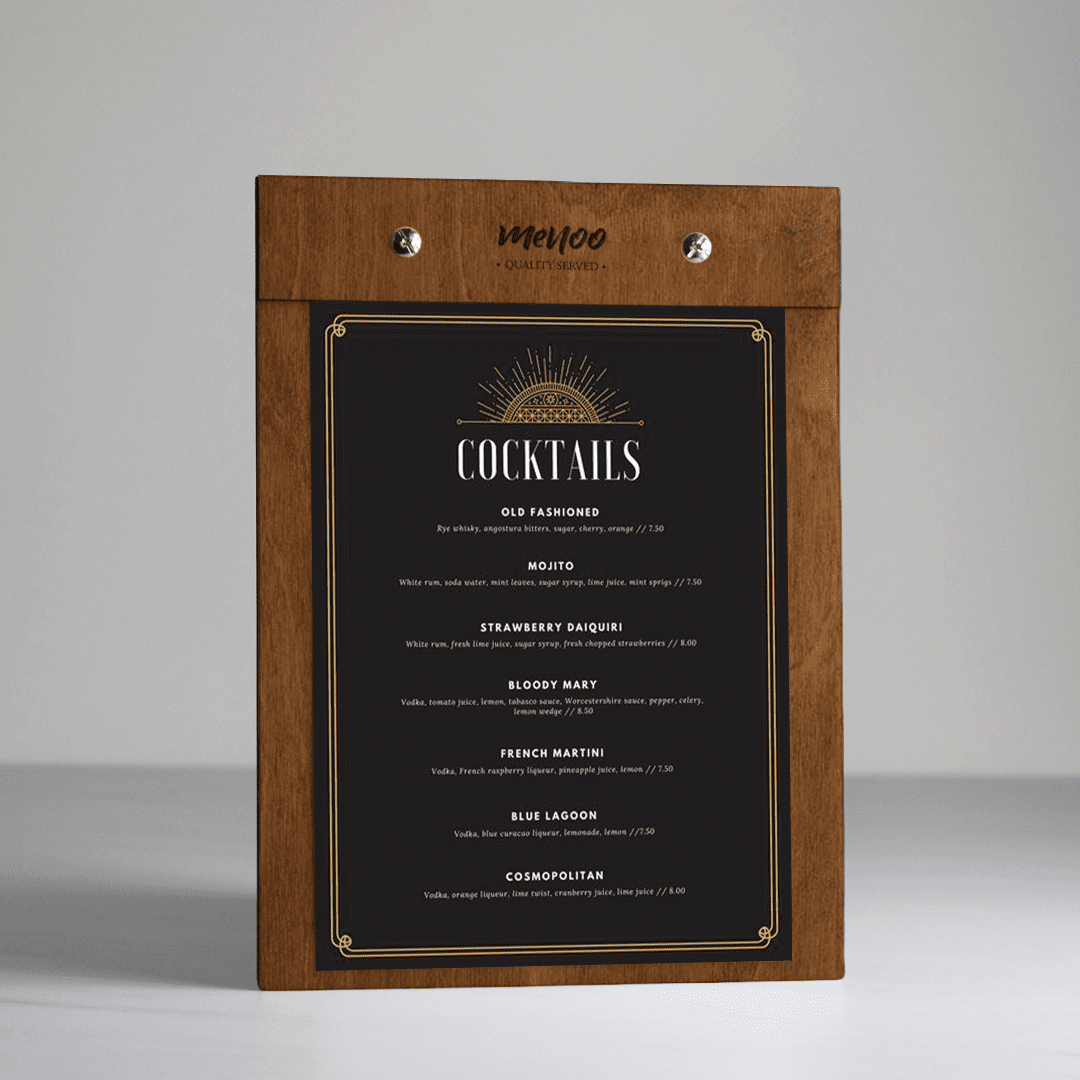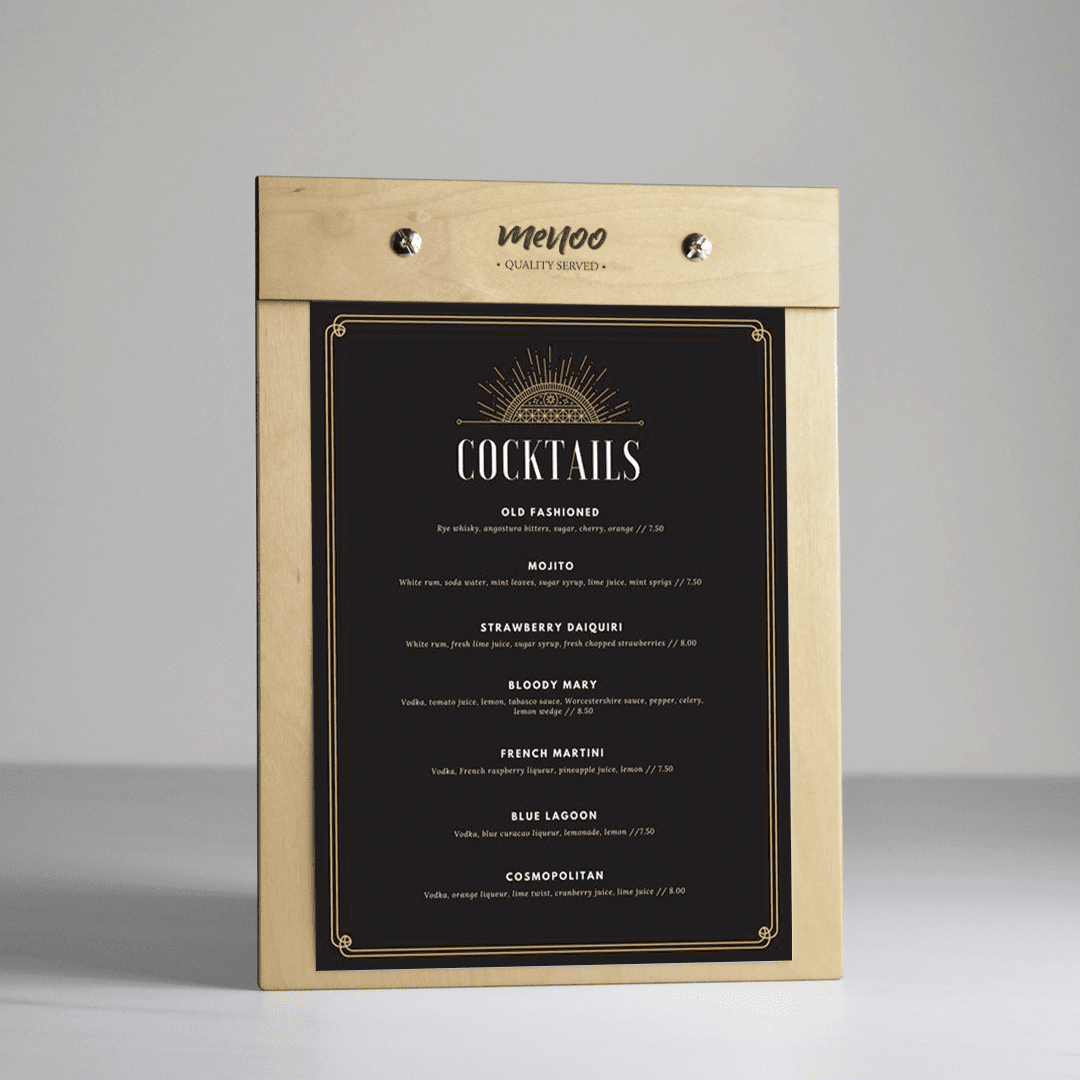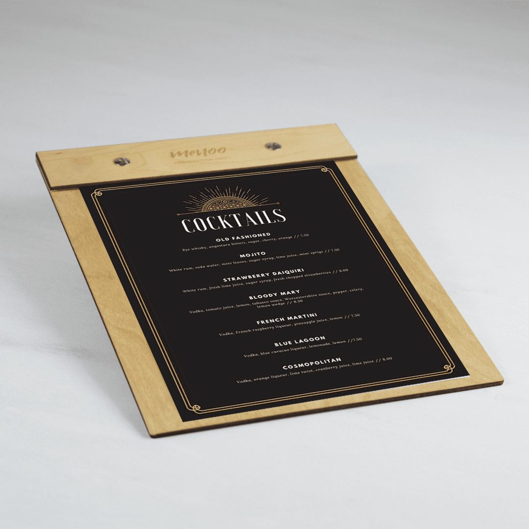 At Menoo, we do our best to make sure that the wood we use to produce our clipboard menus can withstand the test of time. Every clipboard menu holder comes with a 2-year guarantee as our Menoo seal of quality!