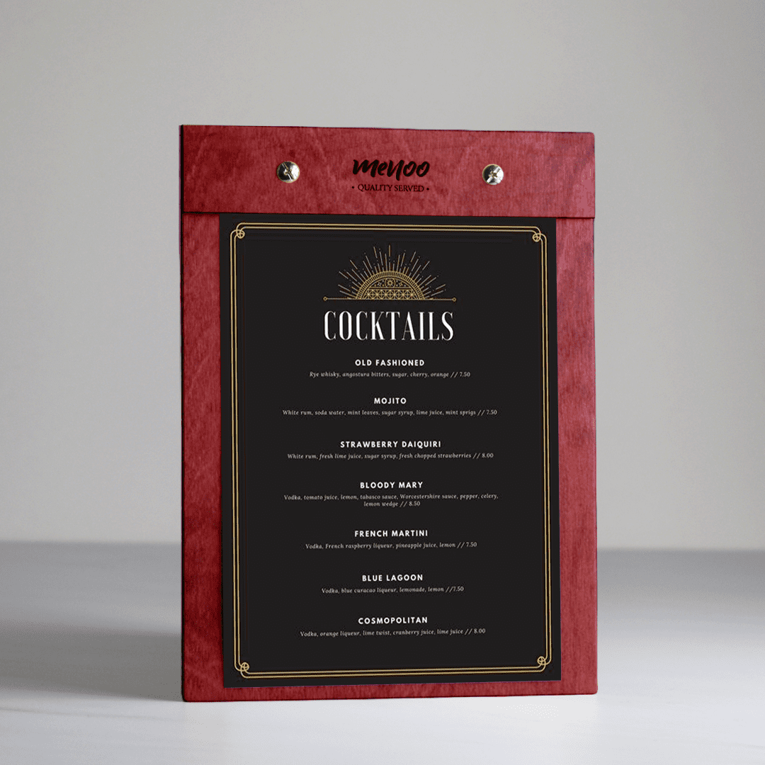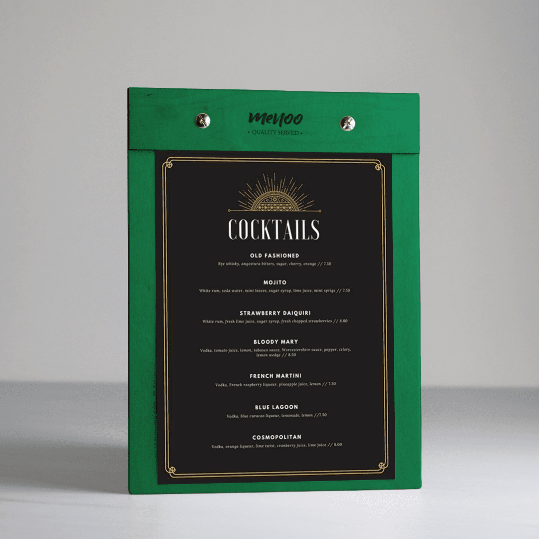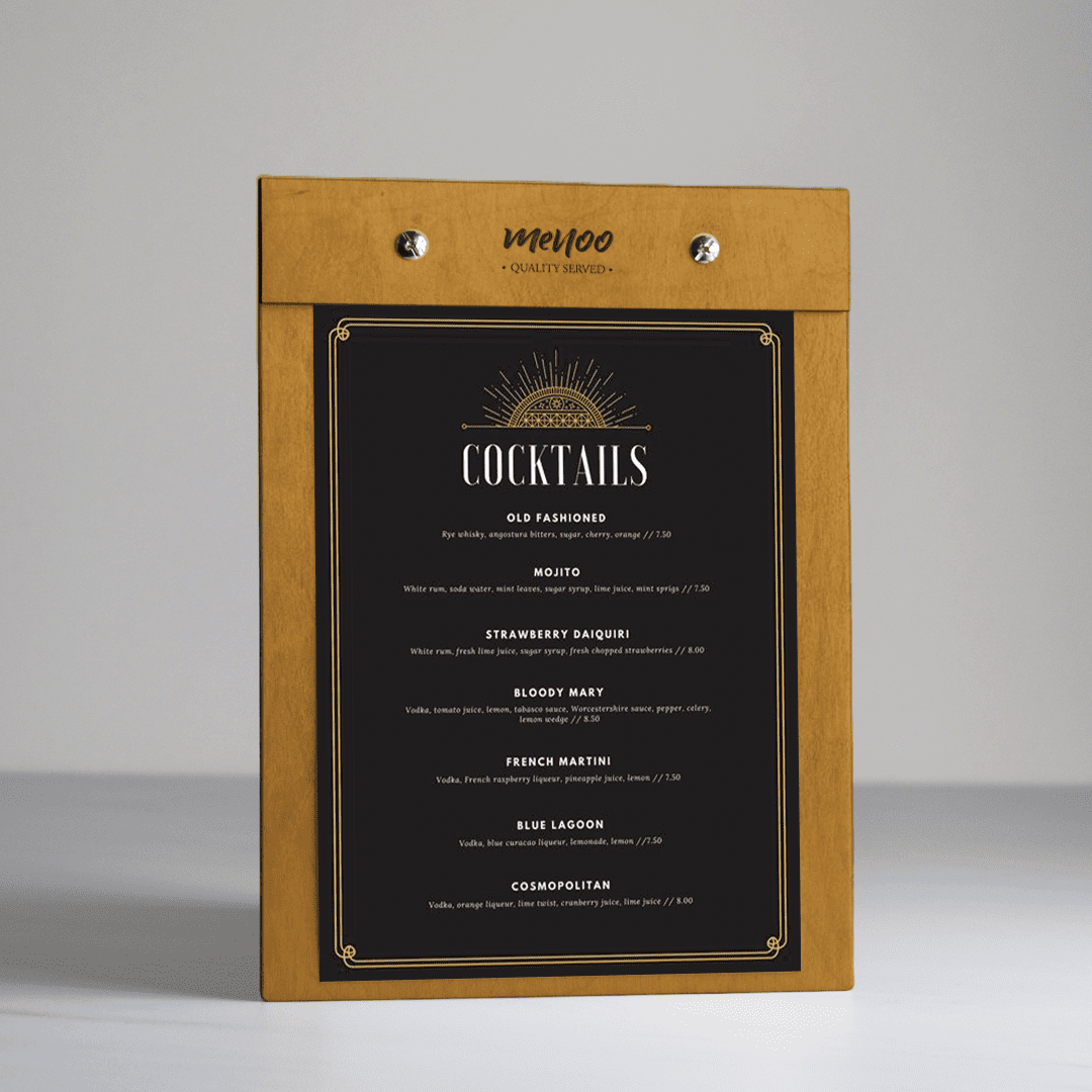 The Menoo Clipboard Menu Holder (A5) is just what you need to get started. Our menu holder is designed in Greece, Europe, with easy page replacement and durability in mind. You’ll never run into issues with updating your restaurant, coffee shop, or bar menu thanks to the clipboard functionality of our holder. If you’re looking for a creative, attractive, modern solution to your establishment’s menu design, look no further than Menoo.